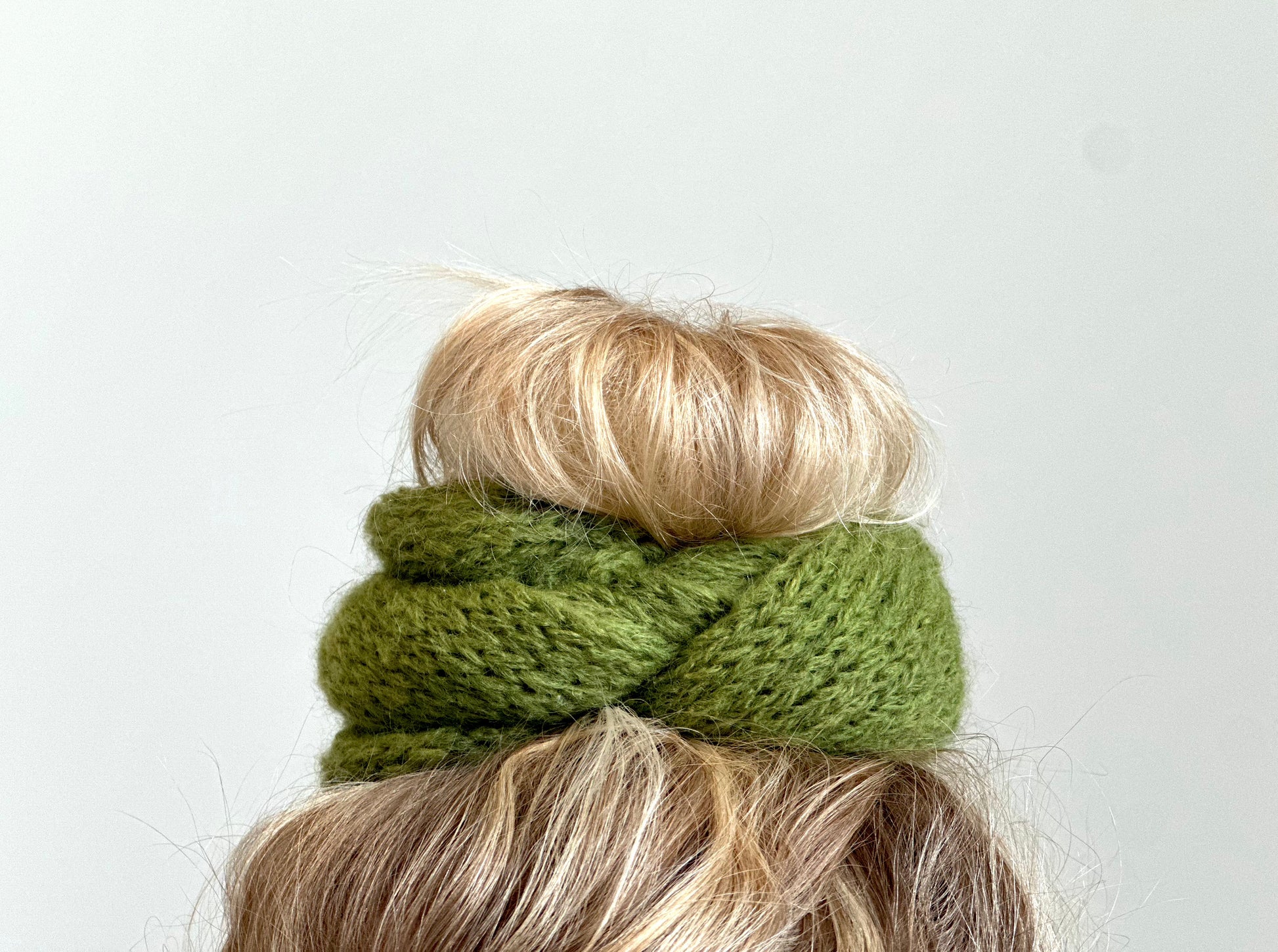 Care instructions: cold hand wash and lay flat to dry. See our other listings for more handmade knit hair accessories, including a 'mini' version of this chouchou.